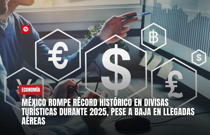 México alcanzó en 2025 un máximo histórico en captación de divisas turísticas al registrar 34,991.6 millones de dólares, cifra que representa un crecimiento anual del 6.2% respecto a 2024, de acuerdo con datos del Instituto Nacional de Estadística y Geografía (Inegi).